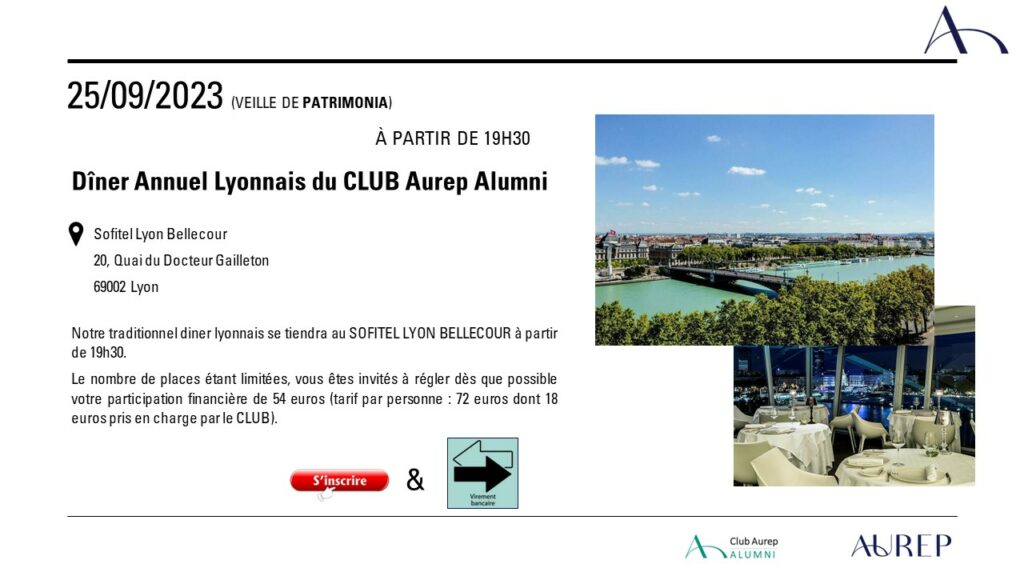 Accueil + Évènements + Dîner Annuel Lyonnais du CLUB Aurep Alumni 2023
