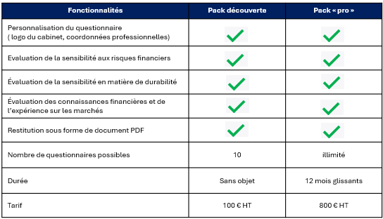 Ce questionnaire de risque permet selon nous de répondre aux obligations réglementaires édictées par les organes de tutelle des conseillers en gestion de patrimoine en matière d’évaluation du profil de risque client.
