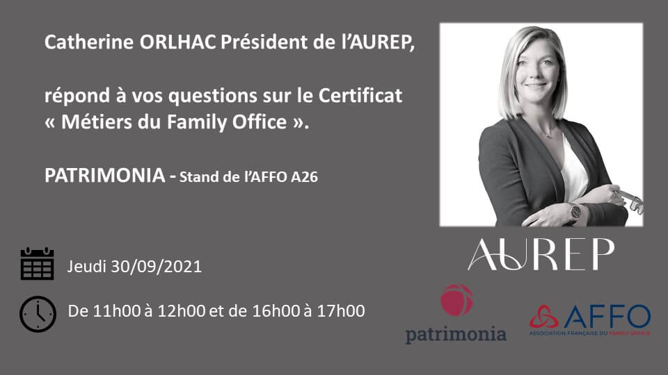 Catherine ORLHAC Président de l’AUREP, répond à vos questions sur le Certificat « Métiers du Family Office », ce jeudi 30/09/2021 de 11 h 00 à 12 h 00 et 16 h 00 à 17 h 00 sur le Stand A26 de l’AFFO-ASSOCIATION FRANÇAISE DU FAMILY OFFICE.