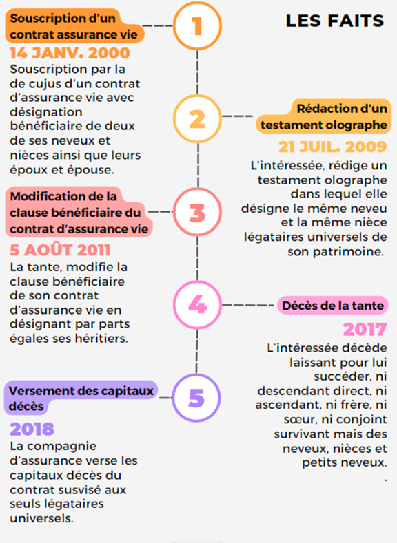 Les héritiers successoraux légaux, ici les autres neveux et nièces, invoquaient la primauté du contrat d’assurance-vie sur la qualité de légataire universel institué par testament. Ils soulignaient en outre que le contrat d’assurance-vie qui, désignant les héritiers, ne conférait pas davantage de droit aux légataires universels qu’aux autres héritiers sur le capital, si bien qu’ils souhaitaient être placés sur le même pied d’égalité. Pour eux, la modification de la clause bénéficiaire en 2011 démontrait la volonté de leur tante « de distinguer le contrat de sa dévolution successorale et ne pas exagérer les avantages confiés aux deux légataires universels qui sont, comme eux, des neveux et nièces proches ».