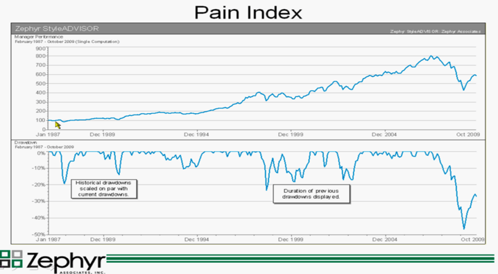 Dans la première partie de notre étude, nous avions présenté le « Max Drawdown » à savoir la perte maximale sur une période de temps donnée. Avec le « Pain Index », nous n’allons pas nous restreindre à la perte maximale sur la période mais nous allons prendre en considération l’ensemble des pertes sur la période.