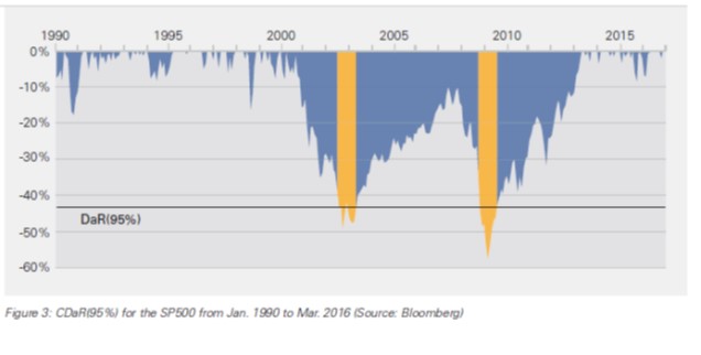 DaR (α) représente le plus important drawdown observé dans (1-α) % des cas et CDaR (α) représente la moyenne des drawdowns observés en dessous de ce seuil. Voici une illustration de ces concepts sur le S&P 500 entre 1990 et 2016.