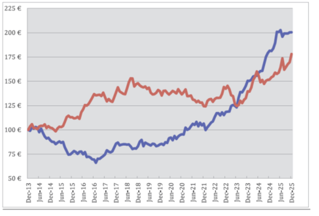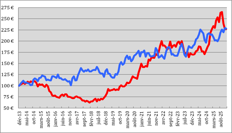 L’Ulcer Index est de 19,4% pour l’investissement « Rouge » et de seulement 7,1% pour l’investissement « Bleu ». Or, plus l’Ulcer Index est faible, meilleure est la situation de l’investisseur et moins, il risque de développer un ulcère en consultant la valorisation de son placement.