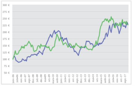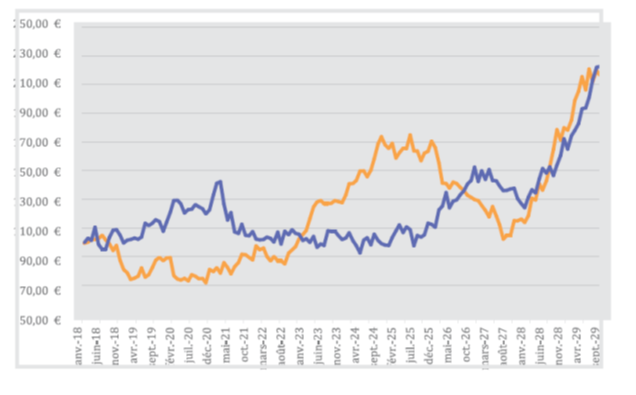 Nous nous sommes tout d’abord penchés sur la notion de volatilité en proposant le graphique ci-dessous représentant deux investissements aléatoires ayant une même volatilité, une même rentabilité au terme et en demandant aux répondants lequel leur semblait le plus risqué.