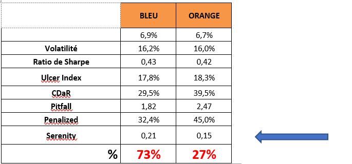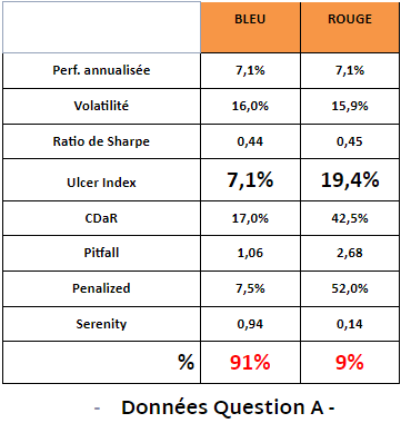 Le rendement annuel de l’investissement « Bleu » était de 6%. Celui de l’investissement « Rouge » était de 4,9%. L’Ulcer Index de l’investissement « Bleu » était de 15,3% contre seulement 8,1% pour l’investissement « Rouge ». Ce qui conduit à Ulcer Performance Index de 0,39 pour l’investissement « Bleu » et de 0,60 pour l’investissement « Rouge ». Pour ce qui concerne le ratio de Sharpe, nous avons un ratio à 0,60 pour l’investissement « Bleu » et un ratio à 0,56 pour l’investissement « Rouge ».