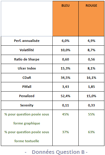 Notons que ces indicateurs auraient également permis de bien identifier le scénario considéré comme le plus risqué par les investisseurs lorsqu’ils ont répondu à la question A, comme le montrent les résultats ci-dessous. En effet, l’investissement « Bleu », qui semble vraiment le moins risqué pour les répondants, a bien un CDaR, un Pitfall et un Penalized Risk très supérieurs à ceux de l’investissement « Rouge ». La performance de ces deux stratégies étant identique, on observe également un écart important de même nature au niveau du couple rendement / risque mesuré par le Serenity Ratio : une sérénité élevée à 0,94 pour l’investissement « Bleu » et une très faible sérénité pour l’investissement « Rouge » à 0,14.