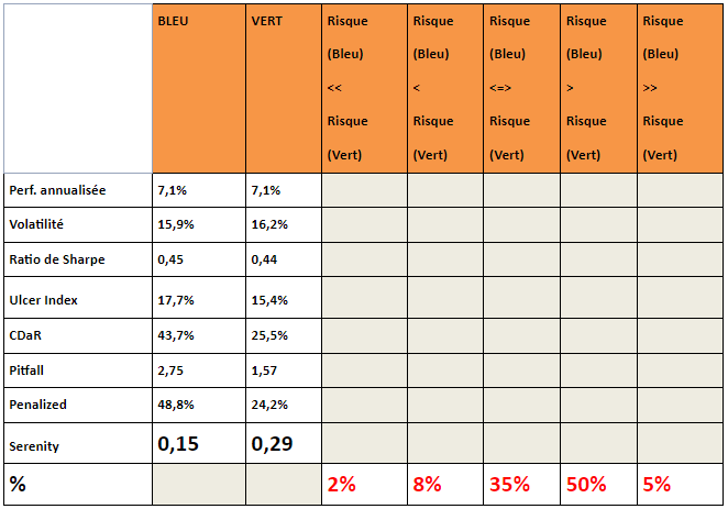 Le CDaR, le Pitfall, le Penalized et le Serenity Ratio apportent donc un progrès dans la captation du risque perçu car ils identifient bien l’investissement « Bleu » comme plus risqué que l’investissement « Vert », comme 55% des répondants (alors que seulement 10% considèrent l’inverse).