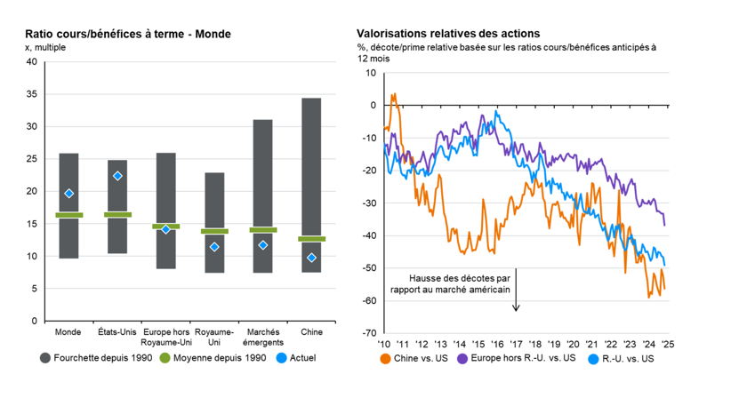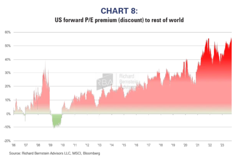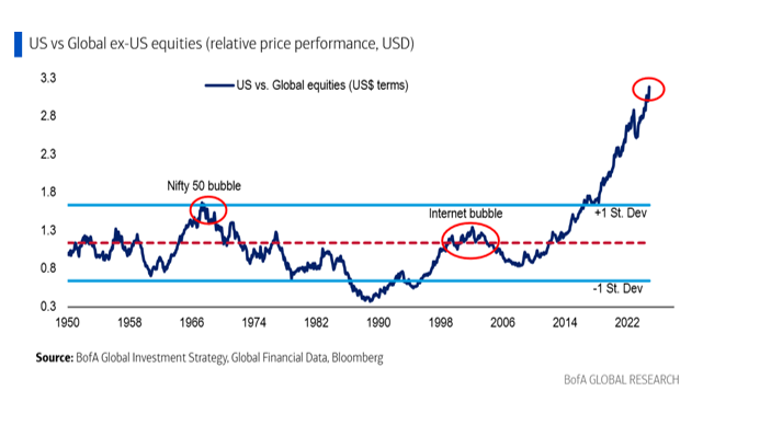De nombreux articles de recherche financière, tant anglosaxonne que française mettent en avant l’écart de valorisation entre les Etats-Unis et le reste du monde, ou plus encore, entre les 7 géants américains ( Magnificent 7 : Nvidia, Alphabet, Tesla, Microsoft, Amazon, Apple, Amazon) et les autres à un tel point que chez RBA (Richard Berstein Advisor), on n’hésite pas à considérer que cela constitue « once in a génération investment opportunity » similaire à celles de 1967-88 pour les actions internationales versus les actions américaines, de 1987 – 2000 pour les actions américaines versus le monétaire, de 2000-2008 pour les actions du secteur de l’énergie versus le reste du marché ou encore de 2009-2023 des actions américaines versus le monétaire. Selon eux, à chaque fois, le marché américain ou un secteur d’activité apparaissait comme le seul et unique investissement à détenir. Or cet engouement et ce manque de clairvoyance conduit inévitablement à des attentes et des valorisations trop élevées, des déceptions et donc une période de sous performance notable.