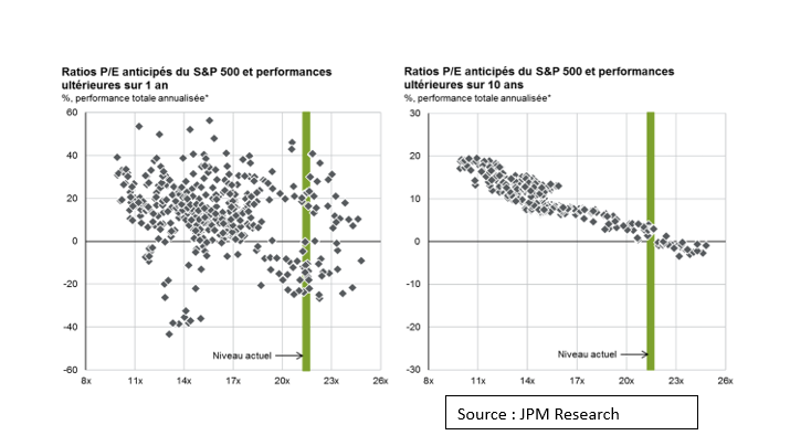 Sur le graphique de gauche, on observe que malgré le niveau de valorisation actuelle, historiquement le marché a pu monter de 40% au cours des 12 mois qui ont suivi et que l’on a quasiement autant de situation de hausse que de baisse à 12 mois. En revanche, sur celui de droite, on observe qu’historiquement, le niveau de valorisation actuel s’est traduit par des rentabilités comprises entre 0 et 5%/an sur 10 ans ce qui est peu pour un actif risqué comme les actions. Ce constat rejoint la notion évoquée précedemment à savoir que quand on investit dans un marché dont la valorisation intègre déjà tous les espoirs concernant l’amélioration de l’économie, de la productivité et des résultats des entreprises, alors au mieux, tout cela se réalise et la rentabilité est proche de la moyenne historique, mais très souvent les attentes sont si élevées que les déceptions sont nombreuses. Il n’est en effet pas rare que l’enthousiame que suscite l’élection d’un nouveau président retombe très rapidement tant les attentes de changement sont immédiates. Le même phénomène appliqué aux marchés financiers lorsque les valorisations sont élevées résulte tout simplement en une très faible rentabilité future.