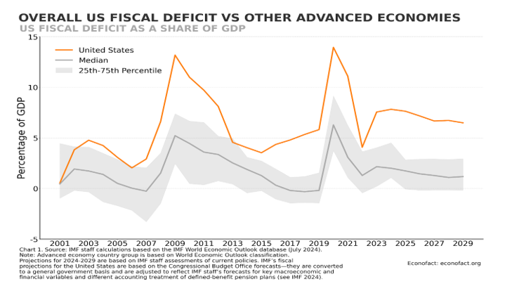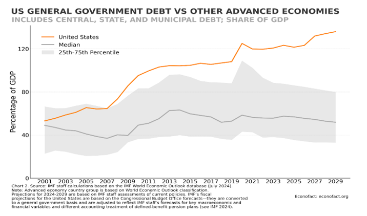 Ceci explique en partie le différentiel de croissance entre les Etats Unis et l’Europe mais se traduit désormais par un niveau d’endettement très élevé avec un coût de la dette qui à lui seul représente plus de 3% du PIB chaque année et qui va s’amplifier si la politique fiscale reste en l’état, situation très similaire à celle de la France, situation qui comme nous le savons, ne peut pas durer indéfiniment.