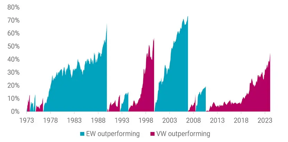 Source: Robeco, LSEG, MSCI. The figure shows the relative performance MSCI World Equal Weighted Index vs. the MSCI World Index. Performance is measured via the total return index and the sample period is May 1973 to June 2024.