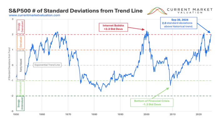 Il existe plusieurs causes qui peuvent conduire à une forte valorisation des marchés actions. Dans le cas actuel, cela résulte d’une hausse des prix plus rapide que celle des bénéfices des entreprises, ce qui implique donc des attentes de bénéfices futurs très élevés. L’IA et plus généralement la domination technologique américaine en sont la cause. L’histoire des marchés financiers nous montre que la croissance des bénéfices des entreprises est fonction du niveau de croissance économique de la zone économique dans laquelle elles opèrent. Ainsi, pour justifier d’un tel niveau de valorisations, les USA vont devoir continuer de croitre à un rythme soutenu. L’arrivée au pouvoir de la nouvelle administration avec un Elon Musk omniprésent laisse envisager une telle possibilité avec l’intégration de l’IA à tous les niveaux et ses bienfaits attendus, notamment en termes de productivité.