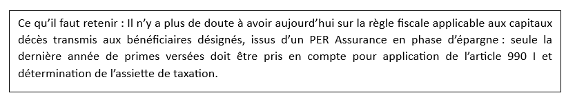 Il n’y a donc plus de doute à avoir aujourd’hui sur la règle fiscale applicable au capitaux décès transmis issus d’un PER Assurance en phase d’épargne, seule la dernière année de primes versées devant être prise en compte.