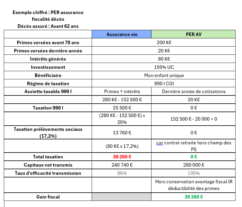 Nous l’avions dit. Nous l’avions écrit. L’administration fiscale le confirme. Un PER assurance reste avant tout un contrat retraite, et le texte fiscal applicable au contrat retraire de manière générale, s’applique strictement et également au contrat PER Assurance, notamment pour la fiscalité en cas de décès en phase d’épargne, permettant de bénéficier d’une assiette de taxation ultra réduite à l’article 990 I du CGI lorsque le décès intervient avant les 70 ans du souscripteur assuré mais surtout avant l’âge de départ en retraite.