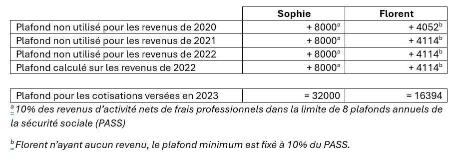 Au demeurant, la cotisation de 35 000 € versée en 2023 viendra consommer l’intégralité des plafonds de déduction de Sophie et subsidiairement celui calculé sur les revenus de 2022 de son mari à hauteur de 3 000 €.