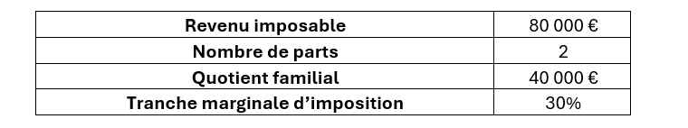 Prenons l’exemple de Sophie et Florent PERRIN, mariés et sans enfant à charge. Sophie avait souscrit en 2023 un PERin sur lequel elle a versé 35 000€. Florent est sans activité professionnelle. Sophie a perçu sur les années 2020, 2021, 2022 et 2023 une rémunération nette de frais professionnels de 80 000€. L’imposition du foyer fiscal avant déduction des cotisations versées sur le PER est la suivante :