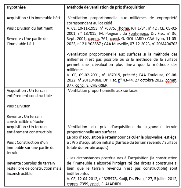 Pour un exposé exhaustif, notre hypothèse de travail sera la ventilation du prix d’acquisition. Il y a lieu de ventiler le prix d’acquisition lorsque la vente ne porte que sur une partie du bien initialement acquis ou recueilli par le cédant. Il en est ainsi dans trois cas.
