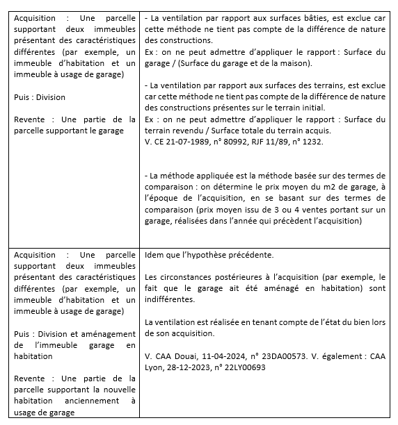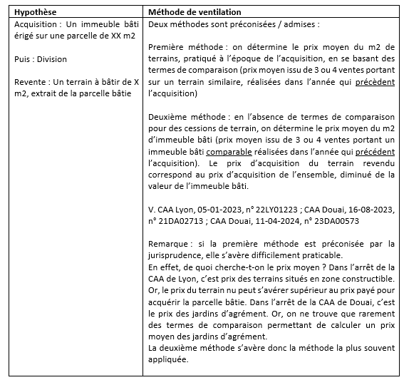 La réponse : Lorsque le bien acquis est composé d’immeubles bâtis divers et terrains, la ventilation du prix global entre les différents éléments paraît complexe mais des méthodes de ventilation ont été élaborées et avalisées par la jurisprudence. Leur mise en œuvre est fonction des caractéristiques du bien acquis et de la partie revendue.