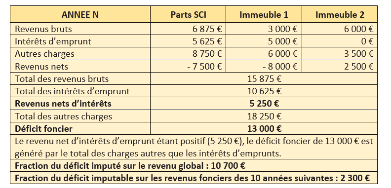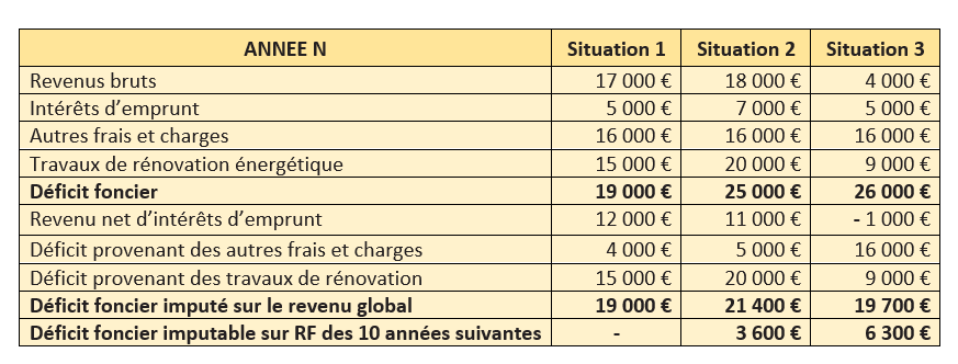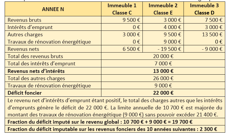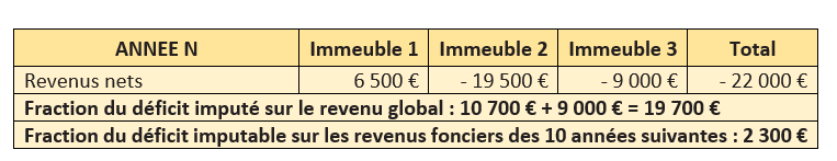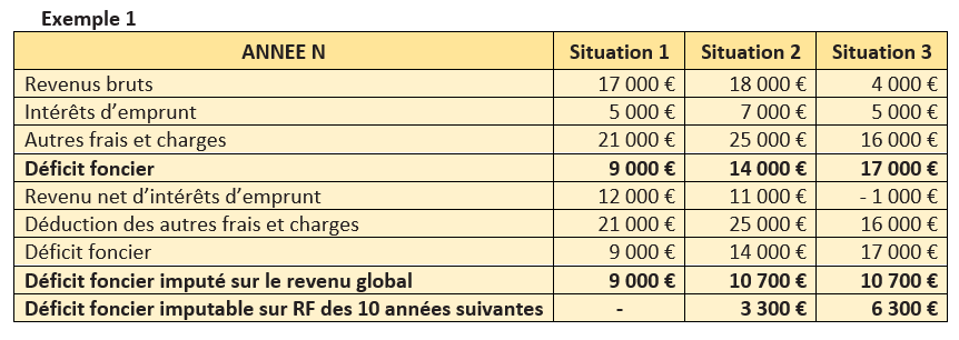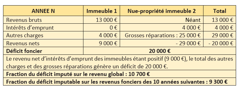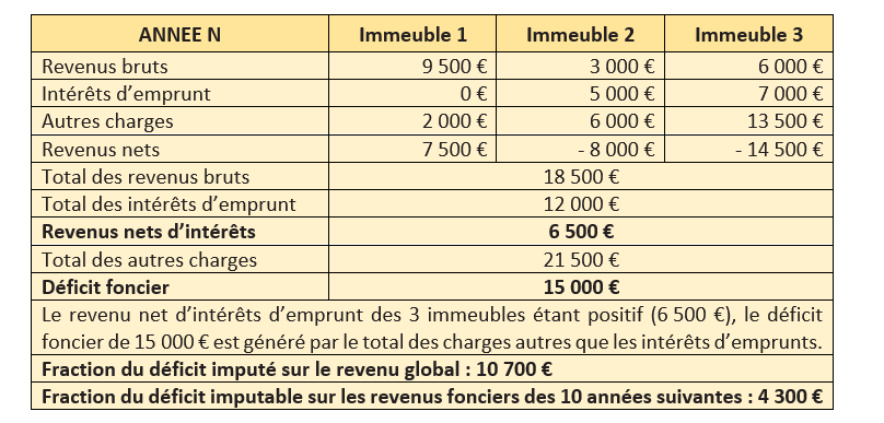 Cette compensation opérée, un déficit peut apparaitre. Pour déterminer alors la fraction de déficit imputable sur le revenu global, il convient de déduire du total des revenus bruts, en premier lieu le total des intérêts d’emprunt, puis, en second lieu, le total des charges autres que les intérêts d’emprunt. La fraction du déficit provenant des intérêts d’emprunt et la fraction du déficit qui excède la limite restent cependant reportables sur les revenus fonciers des 10 années suivantes.