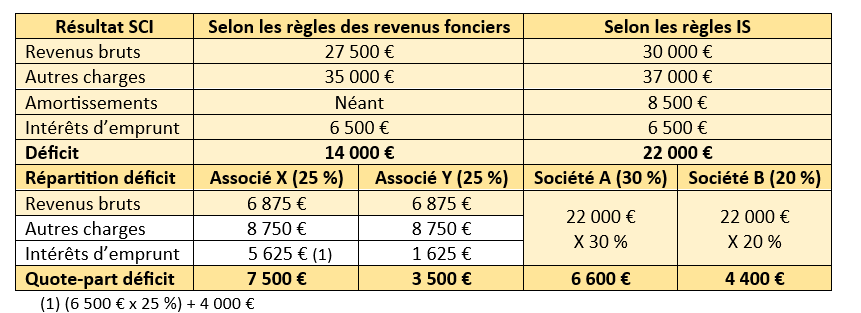 Une SCI compte 4 associés : 2 personnes physiques (X et Y) et 2 sociétés soumises à l’IS (A et B). Les droits des associés dans les résultats correspondent à la répartition du capital : X et Y détiennent chacun 25 % du capital, la société A détient 30 % du capital et la société B, 20 %. La SCI détermine son résultat au titre de l’année N selon les règles propres à chaque associé puis le répartit : il est fait application des règles revenus fonciers (recettes encaissées et dépenses payées) pour les associés X et Y et des règles IS (créances acquises et charges engagées) pour les associés A et B, ce qui explique les résultats différents. L’associé X supporte, au titre de l’année considérée, des intérêts afférents à l’emprunt qu’il a souscrit pour acquérir ses parts dans la SCI pour un montant de 4 000 €.