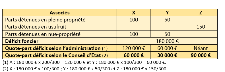 Le Conseil d’Etat a jugé que « l’usufruitier peut déduire de ses revenus la part du déficit correspondant à ses droits » dans la société de personnes détenant un immeuble qui n’a pas opté pour l’IS (Conseil d’Etat 8 novembre 2017, 9ème et 10ème ch. réunies, n° 399764)3. Cette décision infirme la doctrine administrative suivant laquelle le déficit doit être attribué au nu-propriétaire au motif qu’il est le seul à répondre des dettes sociales en sa qualité d’associé (BOFiP-BIC-CHAMP-70-20-10-20, n° 150, 12 septembre 2012)