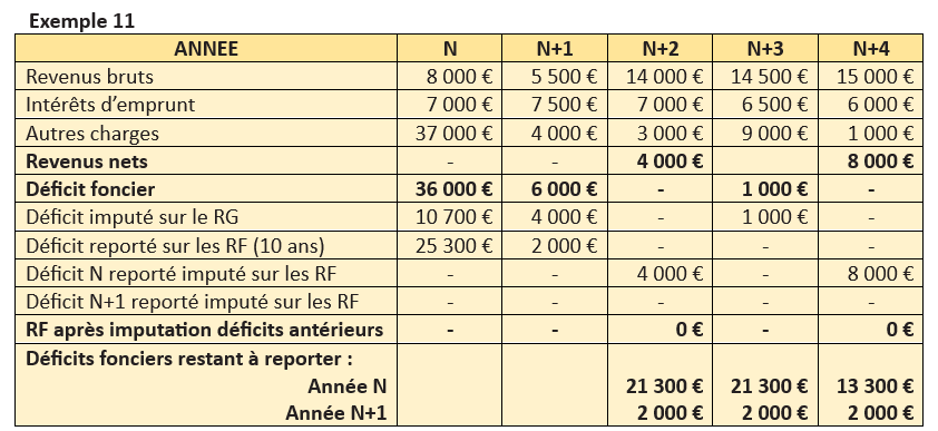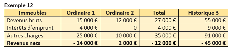 1- Compensation des revenus et déficits des immeubles dits « ordinaires » : le déficit de 12 000 € ne peut pas être compensé avec le résultat de l’immeuble historique puisque celui-ci est lui-même déficitaire. Le déficit ne provient pas des intérêts des emprunts et s’impute par conséquent sur le revenu global à hauteur de 10 700 € ; le solde (1 300 €) est imputable sur les revenus fonciers des 10 années suivantes.