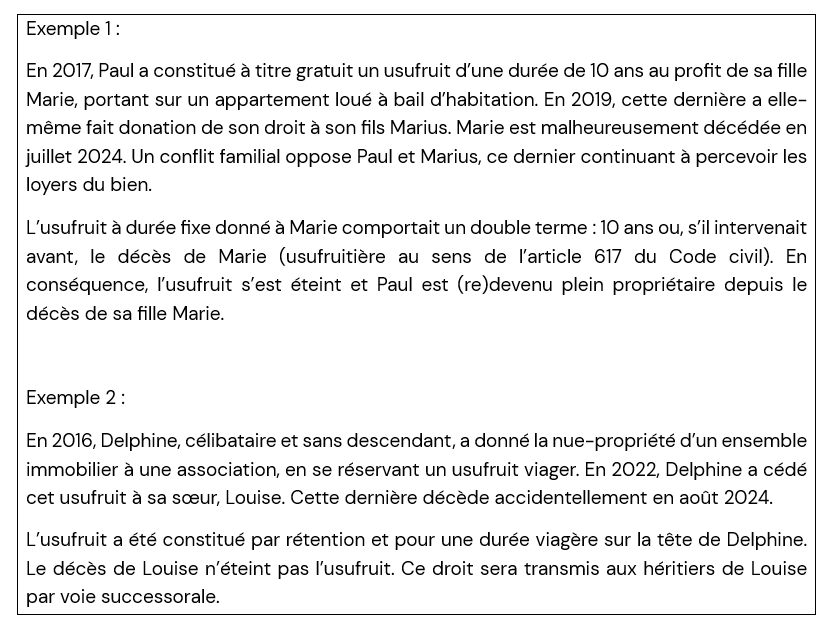 La cession d’usufruit est une opération différente car nécessairement postérieure à une constitution d’usufruit. Elle consiste à transmettre un usufruit déjà existant et, en conséquence, ne permet pas d’en réviser les caractéristiques. En effet, une fois constitué, un usufruit peut faire l’objet d’une cession, à titre onéreux ou gratuit, sans que cette cession n’en modifie ses caractères originels. Le cessionnaire ne devient pas véritablement l’usufruitier[10]. Au sens de l’article 617 du Code civil, l’usufruitier demeure celui qui avait cette qualité à la constitution de l’usufruit. Ainsi, la cession de l’usufruit ne peut ni le prolonger au-delà de la vie du cédant ni provoquer son extinction anticipée par le décès du cessionnaire[11]. La mort de l’usufruitier (initial) éteint l’usufruit ; en revanche, le décès du cessionnaire ne l’éteint pas. Cette hypothèse, rare en pratique, permet de nuancer l’affirmation selon laquelle l’usufruit ne peut pas être transmis par décès. Au cas particulier, l’usufruit pourra continuer à être exercé par les héritiers du cessionnaire jusqu’au décès du cédant, lequel a seul qualité d’usufruitier au sens de l’article 617 précité.